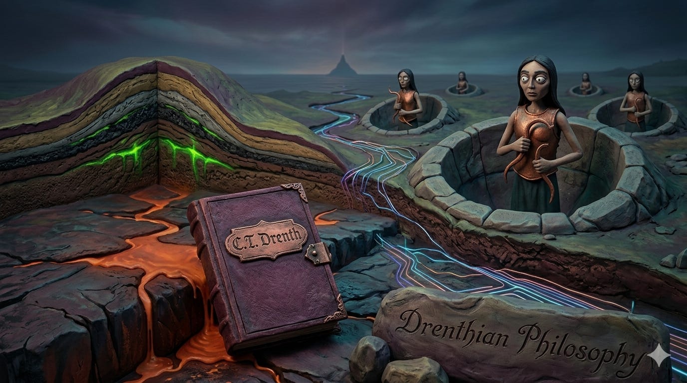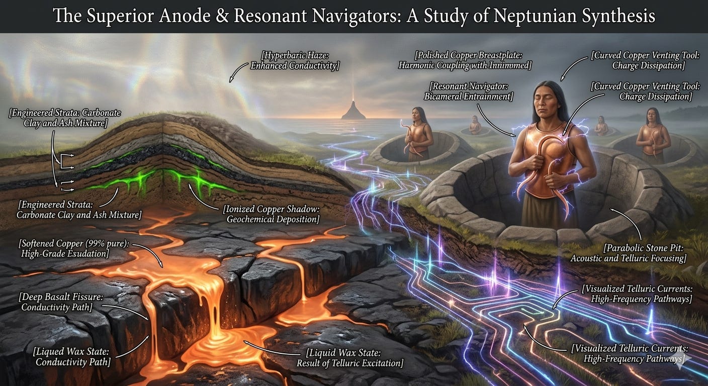 C.T. Drenth’s "Neptunian Synthesis" refutes manual mining myths, theorizing 1.5 billion pounds of Superior copper exuded via telluric currents—the earth "sweating" metal. Bicameral "Resonant Navigators" harvested this conductive "blood" using sonic liquefaction, wiring North America into a planetary circuit. This polymathic inquiry redefines ancient history as an era of biological integration, silenced by the "Isostatic Quench" which birthed modern, internal consciousness.